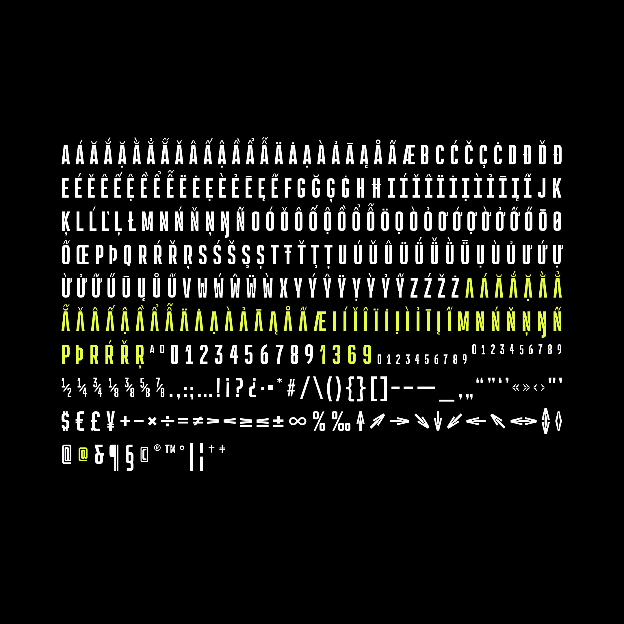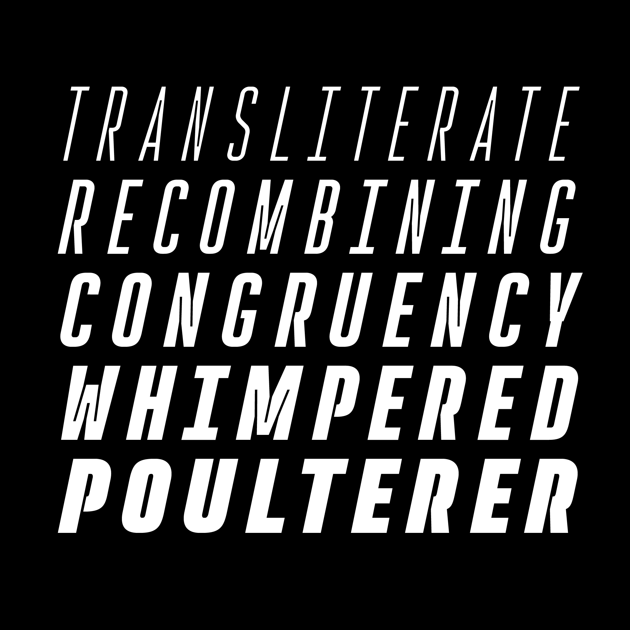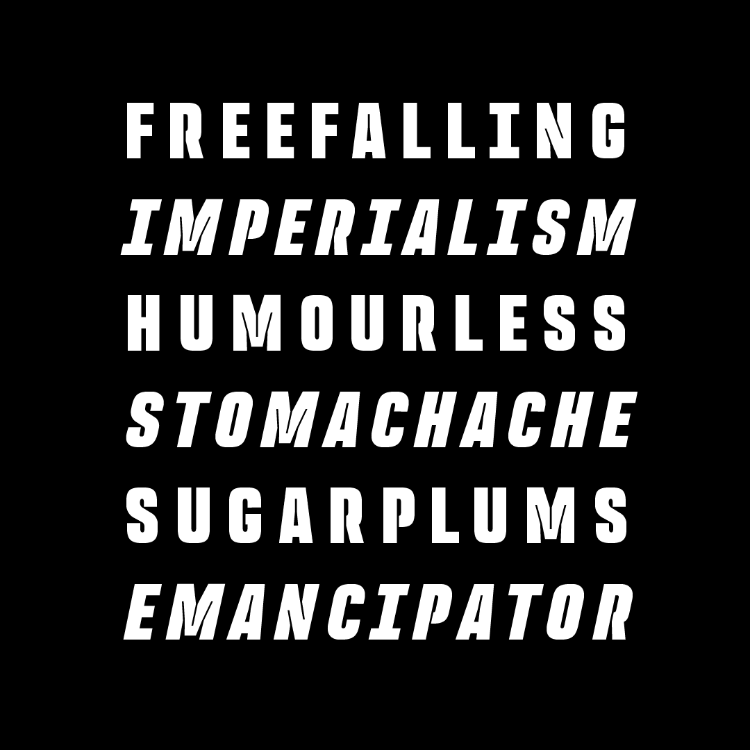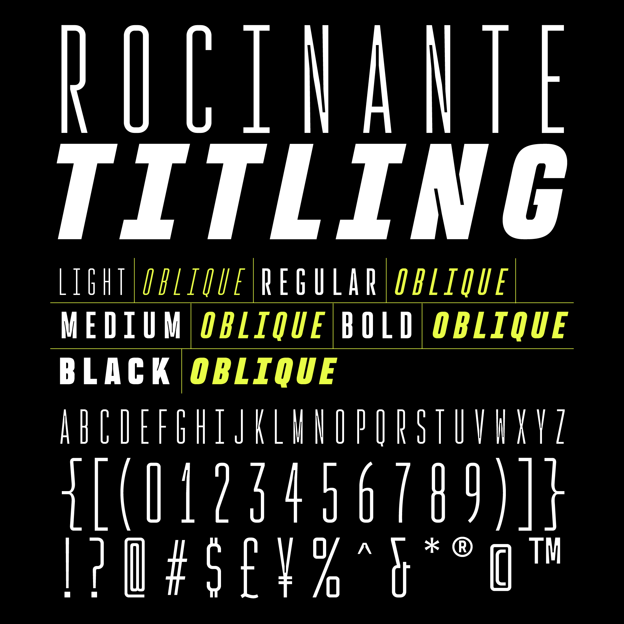 Rocinante Titling is a study in interior and exterior tension packed into a tall, somewhat geometric frame. Lightwells, expanded and enlarged to declare them a design detail and not just a functional compensation, define narrow spaces where strokes must bend to intersect. Rocinante Titling’s stroke weights and spacing match all those of Havelock Titling. Make new combinations while retaining rhythm. Light matches Light, Regular matches Regular, and so forth.