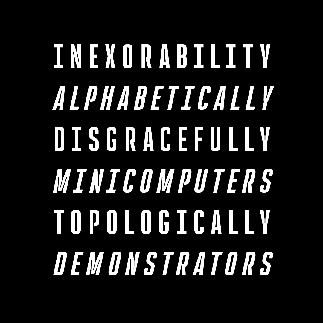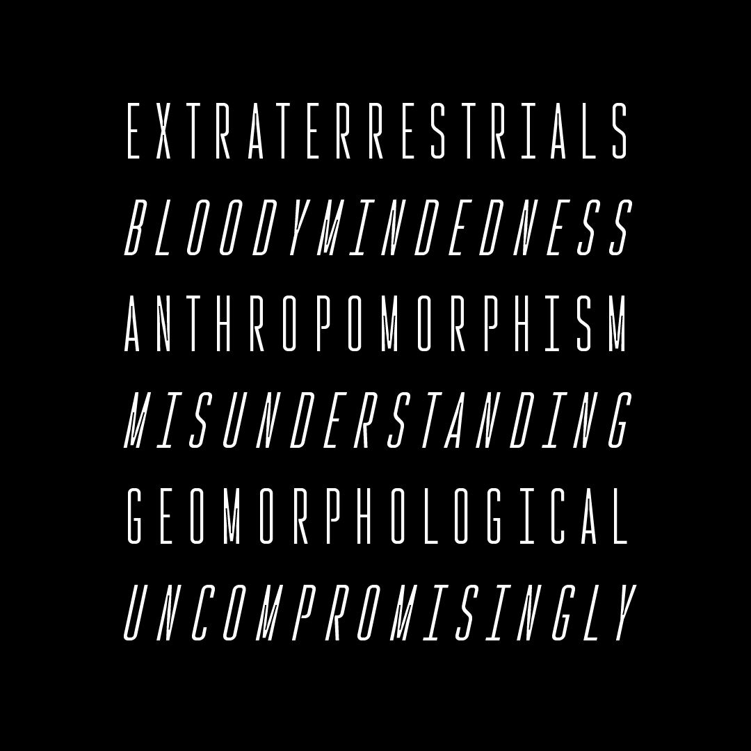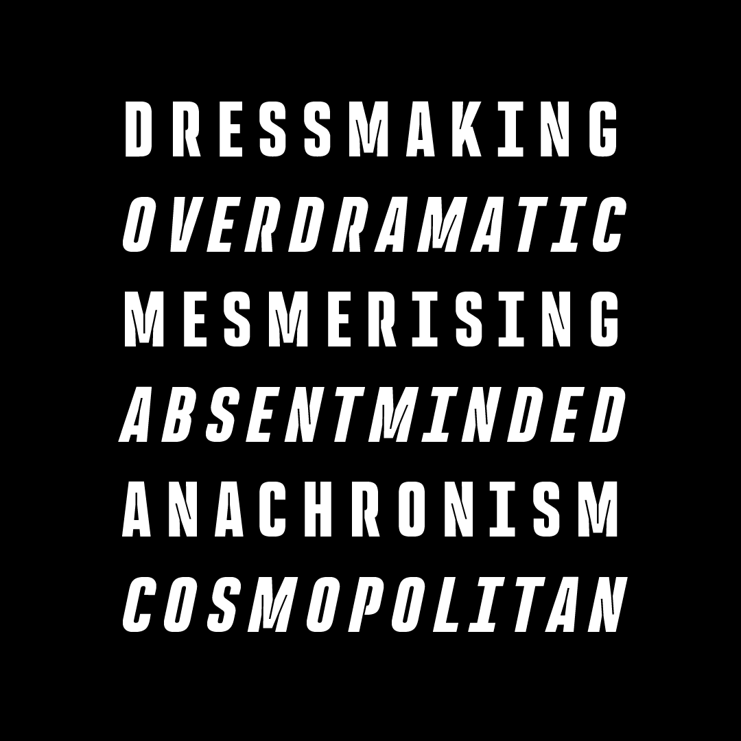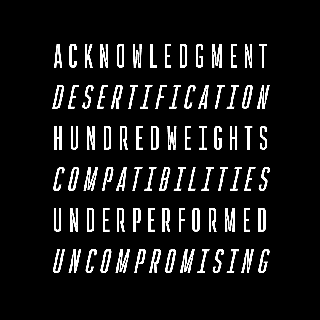 Fun fact: all of Rocinante’s weights align exactly with those in Havelock Titling. You can combine those two for further contrast: the narrowness of Rocinante with the luxurious roundness in Havelock; the tense squareness in Rocinante with the round bubbly joints in Havelock.