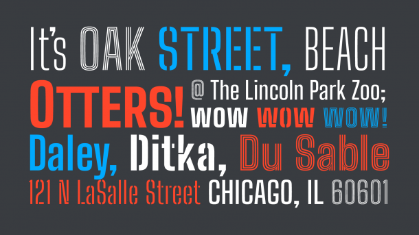 I designed the three Big Shoulders families from the onset to be combined and interchanged. Each letter between versions has the same width and weight, so the designer can swap out a single letter and get a complementary version within words. Or weights can be combined between versions to make interesting visual phrases. In the hands of a non-designer, Dad The Desktop Publisher can mix and match Big Shoulders, Stencil and Inline in the same weight and get a cool visual pattern for his Bears tailgate party or yard sale. Dad can’t go wrong. Good work, Dad!