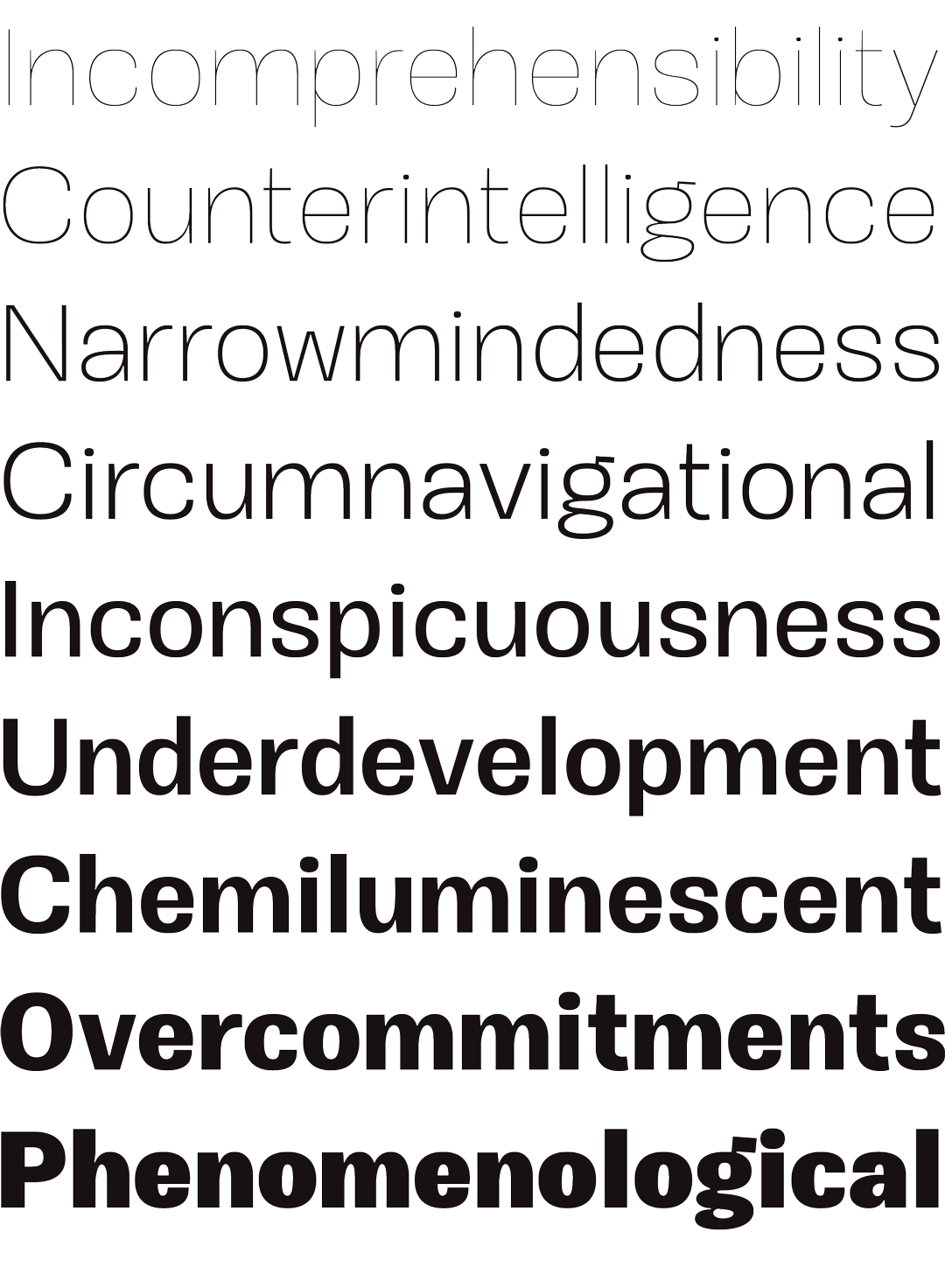 Default spacing got a healthy consideration in the design process as well: Thin to Light are spaced broadly. Regular begins closing spaces between letters; Black is very tight, for brash headlines.